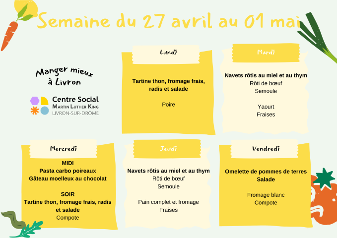 Pour le dessert, mardi soir vous aurez un yaourt nature avec un peu de fraises, pour le jeudi soir du pain complet avec du fromage et également un peu de fraises.
