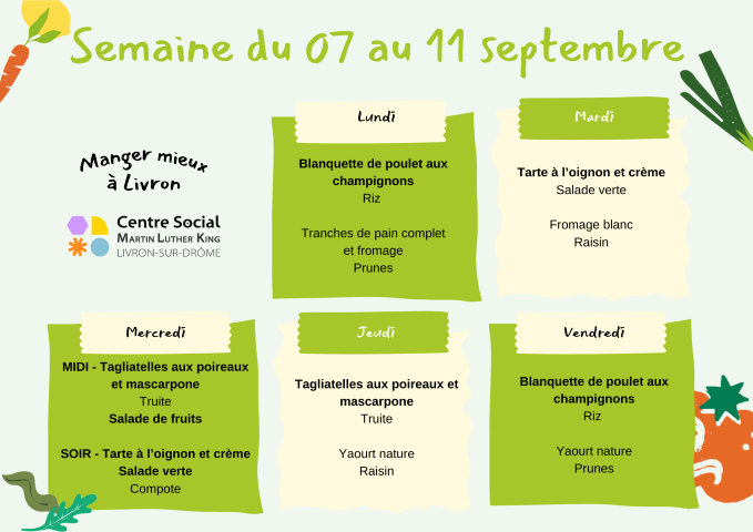 En dessert, mercredi midi vous aurez de la salade de fruits, et le jeudi soir 1 yaourt nature avec du raisins.